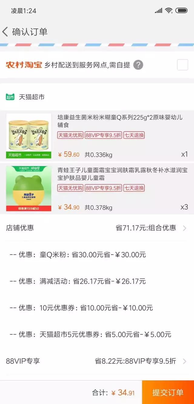相比之下,天猫超市的优惠方式就多了,眼花撩乱,经常结三搭四,熟门熟路的人,很容易就撩出一个漏洞单来。