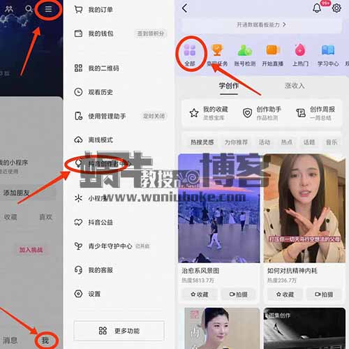2、开通橱窗,打开抖音,在右下角“我”进入个人主页,点右上角的三条杠,找到“抖音创作者中心”进入,点页面上的“全部”,在行业频道里找到“电商带货”,点击进入,点“立即加入抖音电商”,如果没有实名,会让你先完成实名认证。
