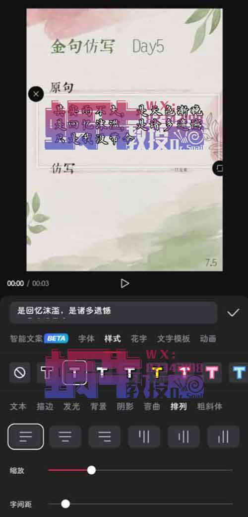 这里的文案可以调整字体、样式等,还可以加一些入场的特效,让文字好像在纸上跳动