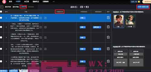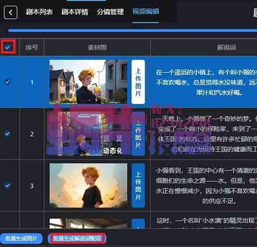 感觉还可以,勾选全部分镜画面,点下面的“批量生成解说和配音”。