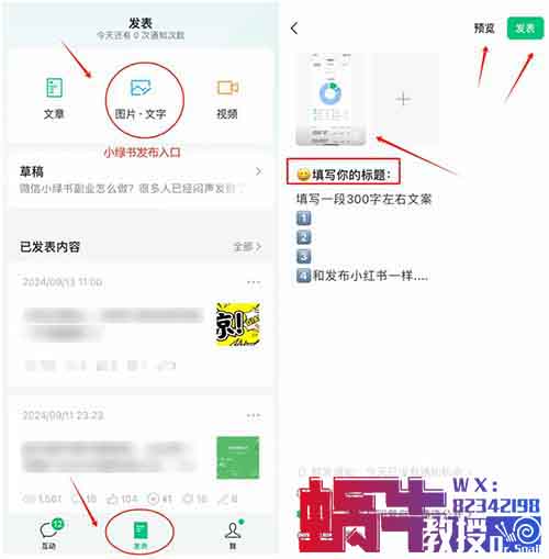 选择“图片·文字”功能,上传图片,填写300字左右的文案,点击发布即可。