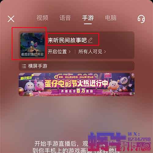 进入到开播界面后,先把封面和标题设置好,封面可以用怀旧视频的截图,标题就写来听民间故事吧,如下图。