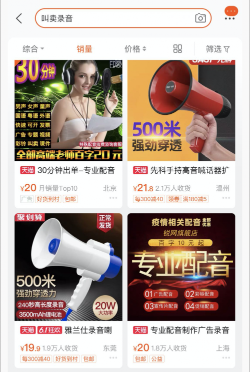 至于上面提到的叫卖录音,你可以找那些普通话比较好的,你可以录制一些常用的,通用的放着,一次性录制永久销售,如果需要定制的那种,你找一些普通话比较可以的大学生直接合作,录制一个音频给与20元 ,做的一大把,一单也可以赚几十元