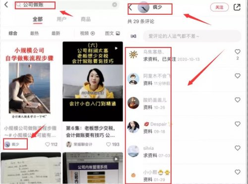 想到这里,我又去小红书搜了一下关键词,发现教别人公司做账,教程资料又是一个可以赚钱的虚拟资料,通过评论就能看到需求也不小,这还只是我随便找的一个案例。