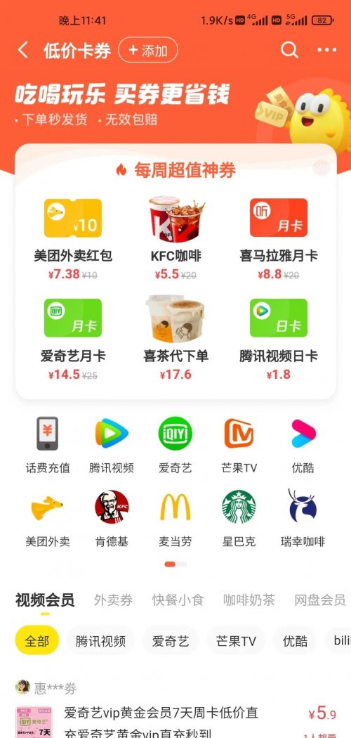 常见的卡券有哪些分类呢?比如视频会员、音乐会员、打车券、快递券、电影票等等。
