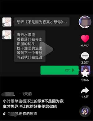来看个账号内容,这个内容制作很简单,就是两个微信对话,其中一个人发几段话或者歌词,说想听什么歌曲,博主就回复一段唱歌的录音,然后利用录屏工具录制下来,用剪映得剪辑功能处理一下,就这么一个简单的作品,8月22日看到的视频,23号再看到,已经10万+的点赞了,预计播放不下五百万