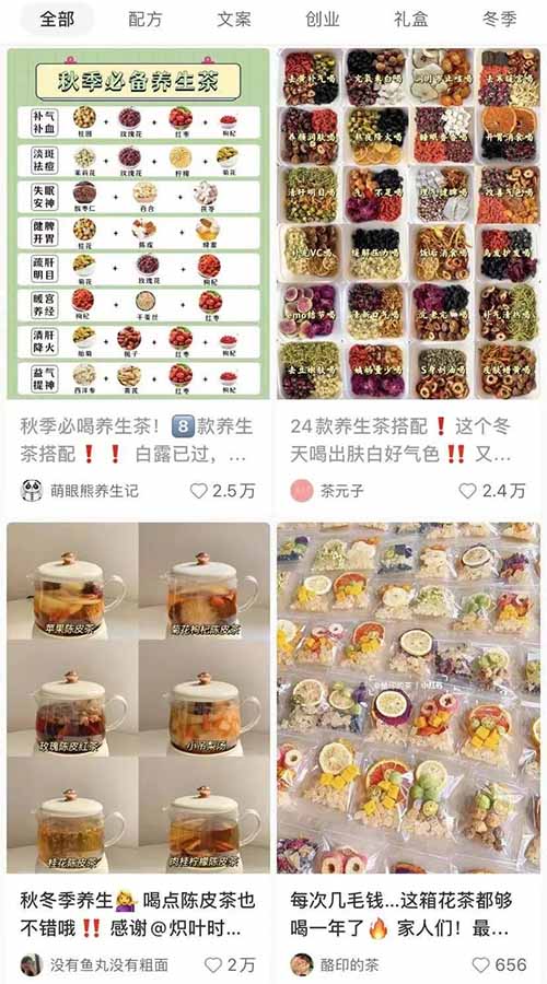 在小红书上搜养生花茶,就会出很多高赞的笔记,把这些内容全部扒下来,然后重新打乱顺序,再用其他图片作为背景,就可以重新组合成新的笔记。