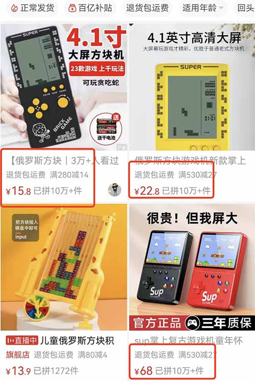 不过通过他这样的操作,我发现这样的游戏机需求真的不小,去拼多多搜索下,排名前面的都是十万+销售,可能有人说这个能是假数据,但是我宁愿相信他是真的,反正我购买了。