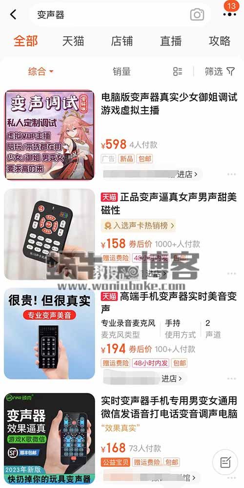 我们进入某宝,搜索变声器就可以搜索到,不过变声这个门道很多,水也很深,买个基础的就可以了。