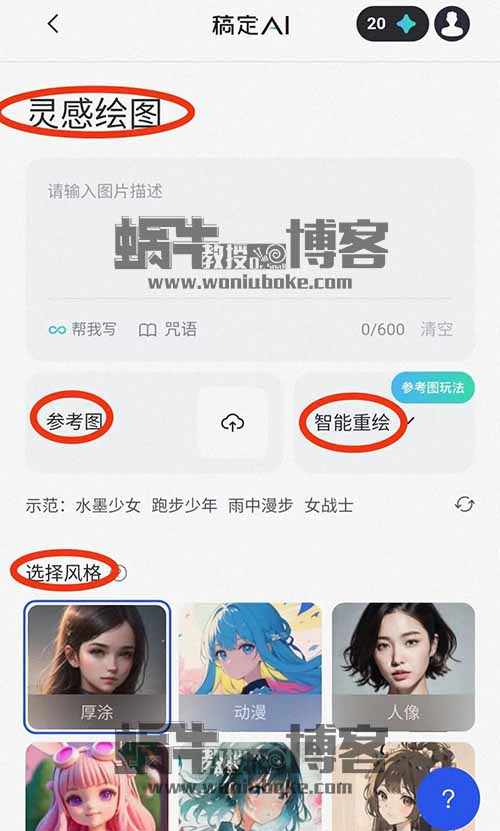 4、打开稿定设计,电脑里在首页里找到“稿定AI",选择“AI绘图”,手机直接点首页的“AI绘图”,在“灵感绘图”里点击“参考图”,上传真人照片,点参考图右边的“智能重绘”选择“智能重绘”。