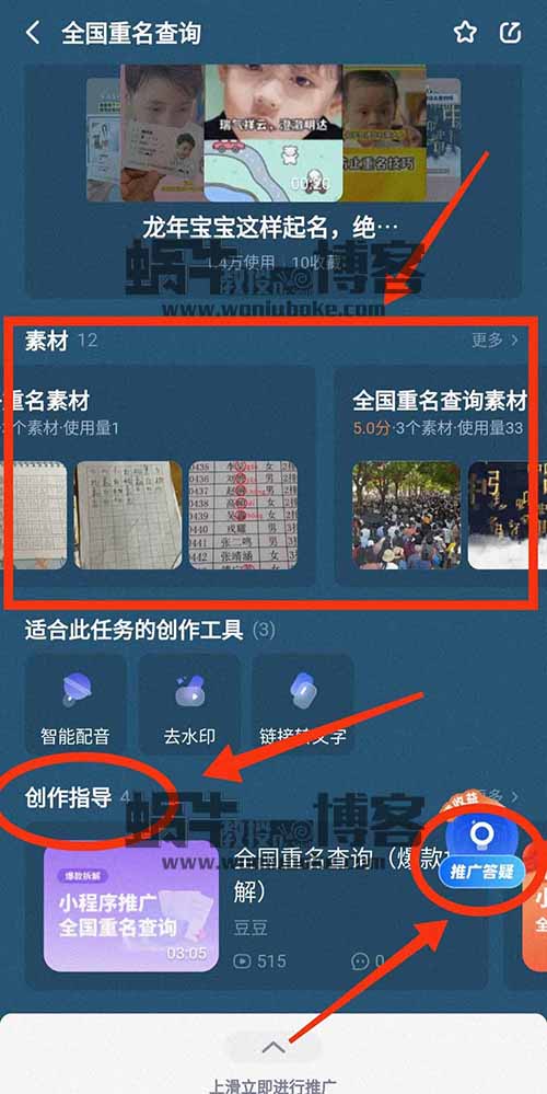 6、素材。点开选择的测试小程序,下划到后面就能看到平台提供的素材。后面的创作指导可以看看。