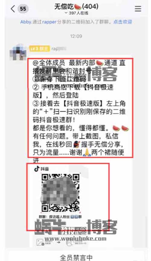 这种情况,大多数做吃瓜的都会选择做付费进群,比如设置2、3块进群费用,四、五百人就是几千,扣扣群可以直接设置付费进群,比较方便做这些小项目,还有人直接做起了某音极速版拉新,进群是免费的,用“免费瓜”引导进群,在群内发会和谐,需要下载某音极速扫码进群,顺理成章完成用户拉新。