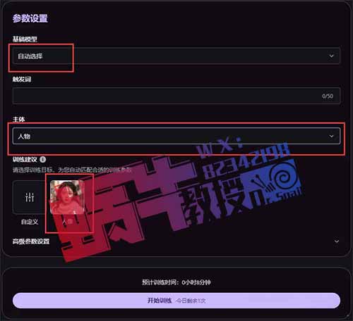 填写参数设置,可以参考以下建议:基础模型选择“自动选择”,触发词可留空,主体选择“人物模型”,建议设置为人像。