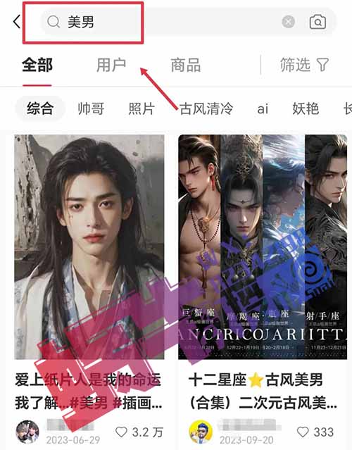 然后新号的资料信息先不要填,注册后直接搜索与帅哥、美男相关的话题,搜索出来的帅哥笔记,我们点进去随便点点赞、关注一下、评论几句。这个步骤重复3天。