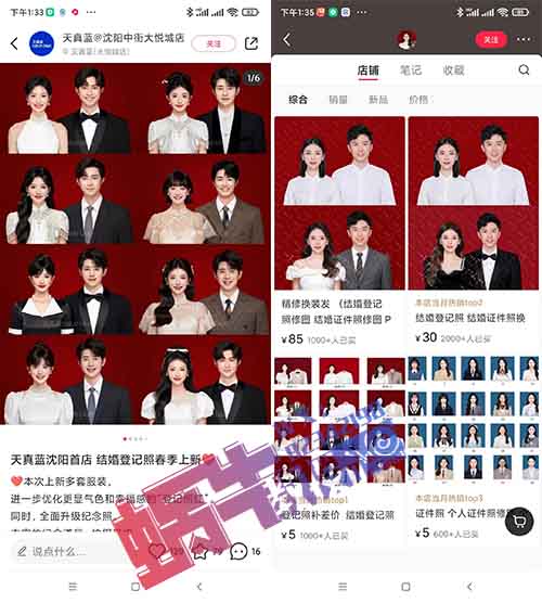 图文内容核心就是一张图片,图片分上、下两个部分,上面这部分是正常的,去民政部门登记的结婚照样式,下边图就是用上边的图换装之后形成的效果,需求量非常大,下面这个号做的就是笔记发图文,给别人提供结婚照换装的服务。
