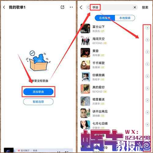 比如我想添加经典怀旧老歌,我在搜索框输入“怀旧”,就能找到很多怀旧老歌,点击“+”号添加即可,如下图。